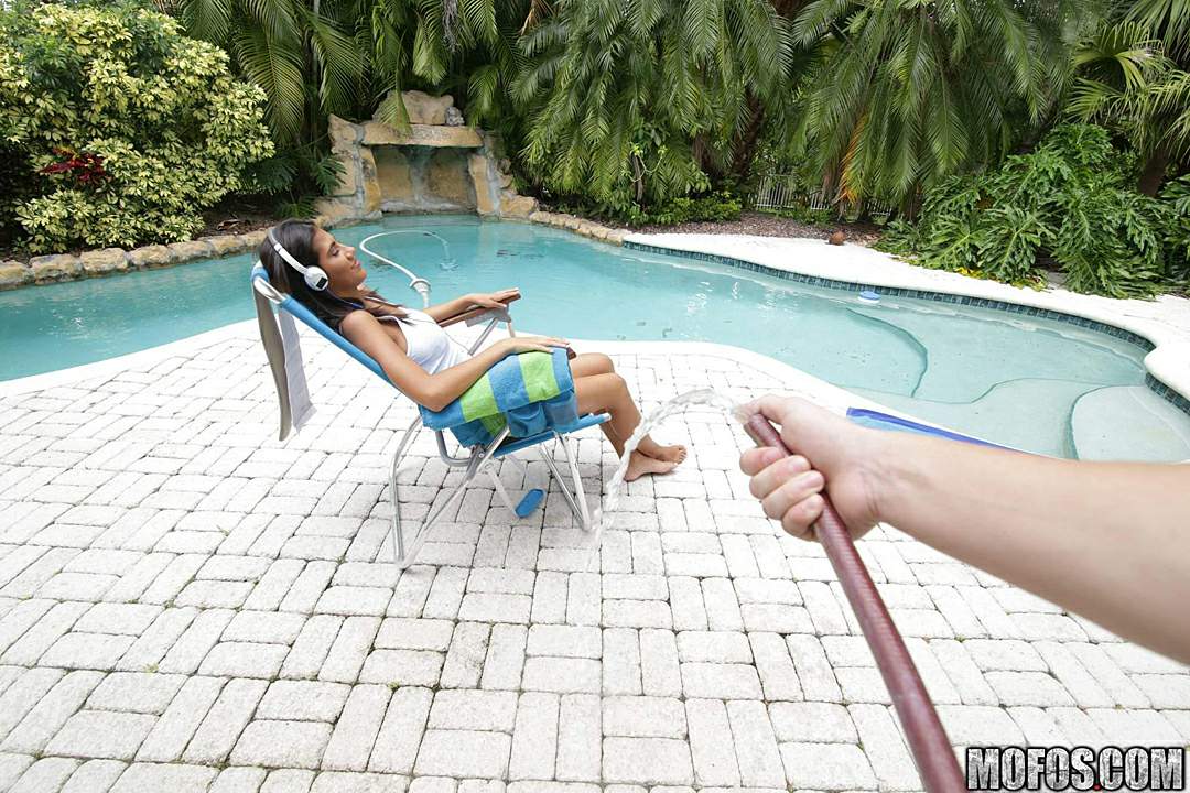 Victoria Valencia picked the perfect shirt to wear today. That wet white t-shirt makes her cute, perky nipples look absolutely bangin' in the rain. It's also the perfect handle for the dude who's slammin' her fine Latina booty from behind.